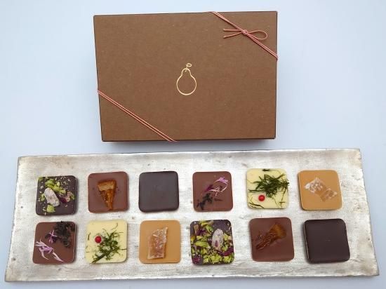 【原材料】 カカオマス、カカオバター、砂糖、全粉乳、紅茶、ヤグルマギク、ピスタチオ、ラズベリー、ピンクペッパー、生姜、オレンジ、クローブ、青のり、トリュフ、塩、バニラ、転化糖 、水あめ、麦芽エキス、乳清/乳化剤(大豆由来)