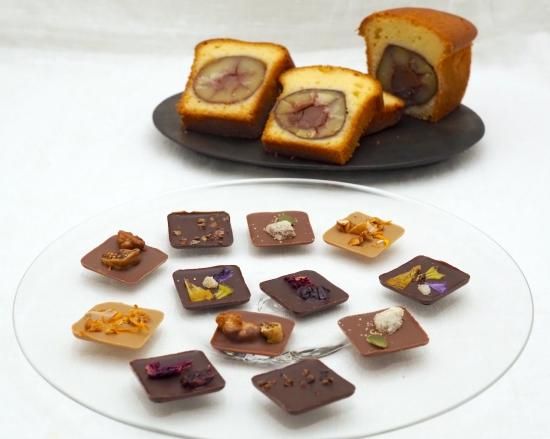 マロン、イチジク、落花生、キウイフルーツなどの素材を4種類のチョコレートと取り合わせました。