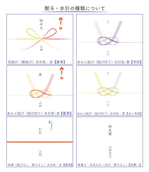 ご希望の方は、水引の種類、表書きとお名前のご入力の上、必要数量をカートに入れてください。