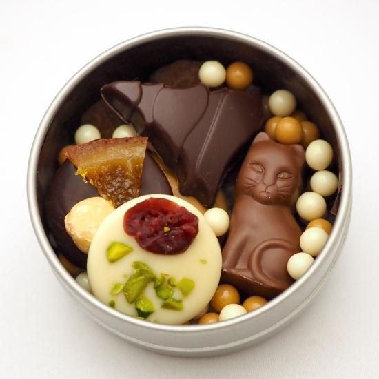 クリスマスの可愛らしい形のチョコレートを丸缶に詰め合わせました。