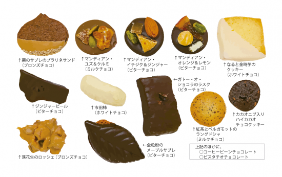 カカオマス、カカオバター、砂糖、小麦粉、バター、卵、無花果、生姜、市田柿、ピスタチオ、アーモンド、オレンジ、レモン、ヘーゼルナッツ、ゆず、カボチャの種、胡桃、さつまいも、落花生、カカオニブ、コーヒー豆、紅茶、ケシの実、メープルシュガー、ベルガモット、バニラ、塩、全粉乳、乳清/乳化剤(大豆由来)